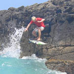 Drop or not ? Die ewig gleiche Frage. Einsteigen oder sein lassen. Risiko oder Beständigkeit. Ausprobieren oder sein lassen. Schauen wir uns das Foto Links an. Es zeigt Gerry Schlegel. Seit dem Kinofilm „Keep Surfing“ kein Unbekannter mehr. Er ist eigentlich ein Riversurfer und daher gewöhnt die Wellen nicht anzupaddeln, sondern draufzuspringen. Was macht er nun am Meer ? Drop ! Was kann da nicht alles passieren. Man kann sich den Fuss verstauchen. Oder das Brett bricht. Oder man rutscht ab und verletzt sich am Felsen. Oder halt man nimmt die Welle und reitet sie bis an den Strand, wo man dann mit einem Grinsen absteigt. Bei dem Foto müssen wir auf den Fotographen, Sigi vom ineika Surfcamp, hinweisen.